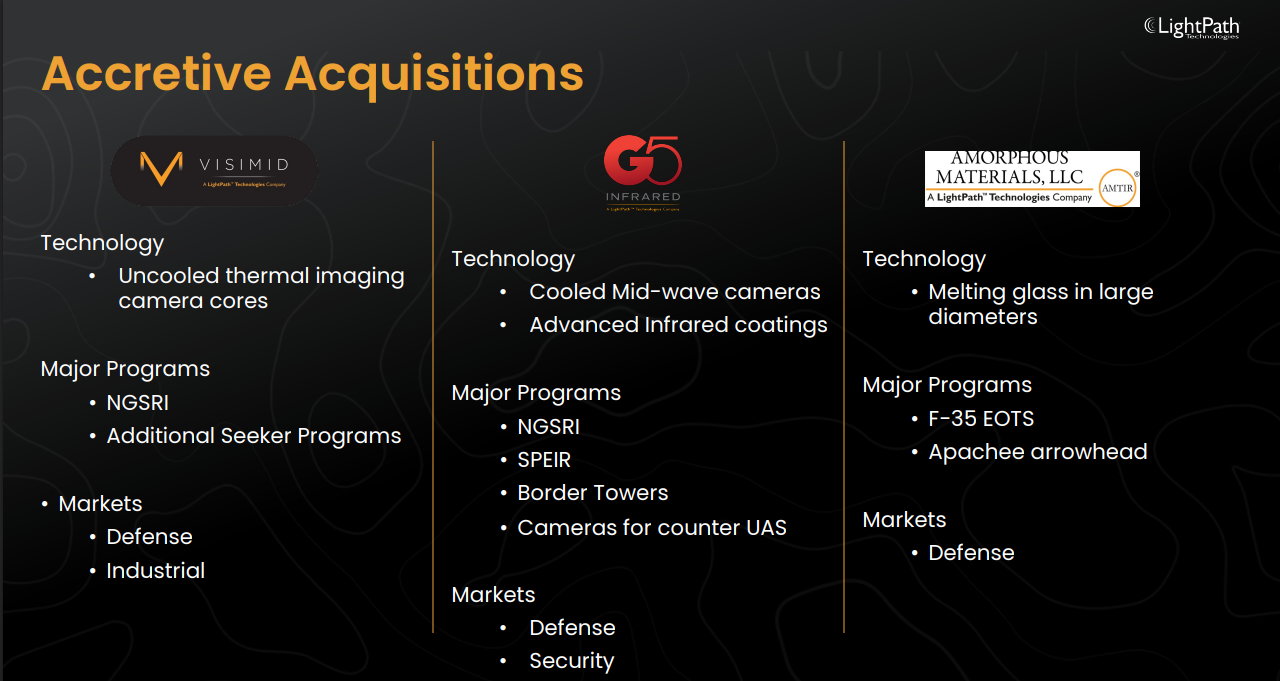 Lightpath has made 3 major acquisitions recently: Visimid, G5 Infrared, and Amorphous Materials. Visimid and G5 were both key acquisitions needed to advance their reach into major NGSRI (Next Generation Short-Ranged Interceptor) programs where they are working as the primary contractor for Lockheed Martin. If LMT 0.00%↑ wins this contract it would provide them with $50-100 million in recurring annual revenue. Through their work in this program other primes have caught on and we know they have 2 additional programs currently in the works for NGSRI related initiatives. Their other huge revenue driver is through cameras on border towers. G5’s technology enabled them to secure deals with 2/3 contractors working on domestic southern and northern border towers with the potential for additional work with the 3rd.