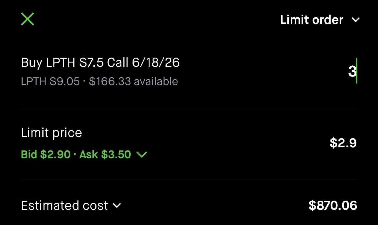 3. LPTH 0.00%↑ 15% Starting Target: I went in the money options for LPTH due to the expiration date for options not being farther out. I want a safety net and less exposure to theta decay which in the money options provide.
