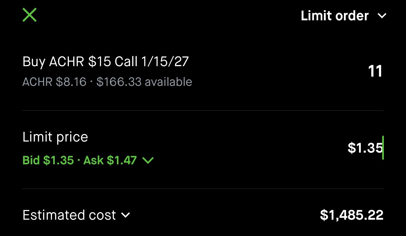 2. ACHR 0.00%↑ 15% Starting Target: ACHR should be another good one. I took farther out of the money calls and a longer than 1 year expiration date to give it a longer time horizon after its fall from the $14s in 2025.