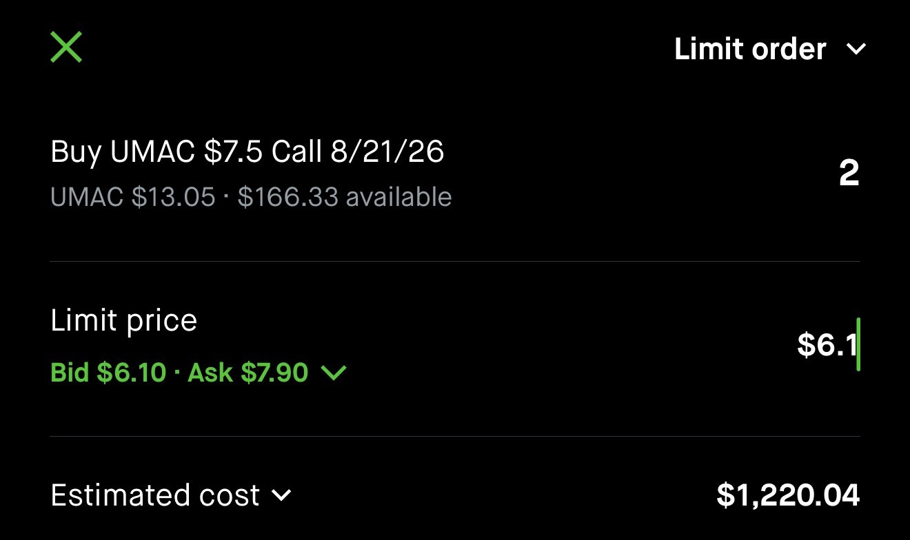 6. UMAC 0.00%↑ 10% Starting Target: I took deep in the money calls for UMAC. I did this because out of the money calls are too expensive for my taste. The bid/ask spread here is wide so these may not fill but if I take the trade I want value.